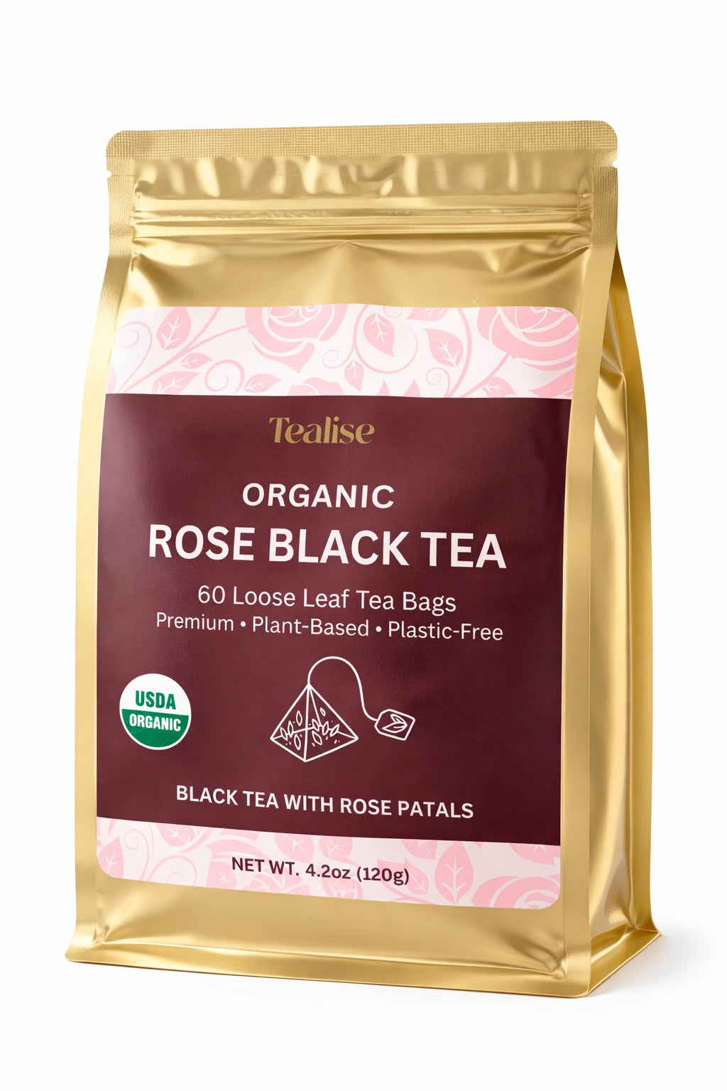 Tealise Organic Rose Black Tea Bags combine USDA certified organic black tea with delicate rose petals to create a smooth, fragrant, and well-balanced tea.